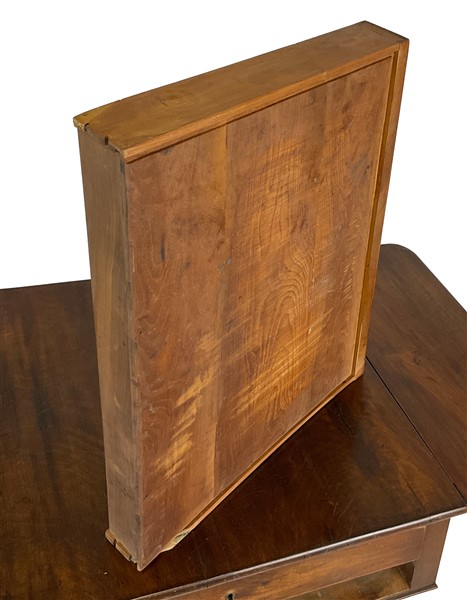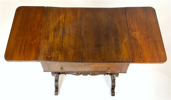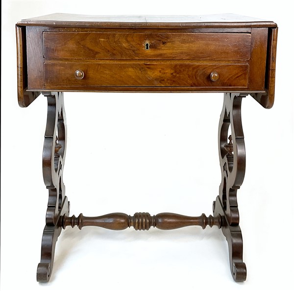 Tavolo da lavoro in noce ad alette con due cassetti sul fronte, sostegni arcuati e centrati da pinnacoli con traversa tornita. Secolo XIX (cm 63x74x48) (difetti)