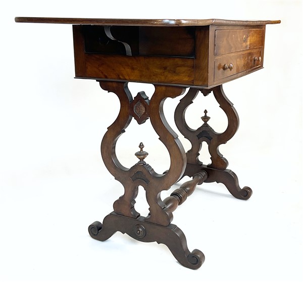 Tavolo da lavoro in noce ad alette con due cassetti sul fronte, sostegni arcuat