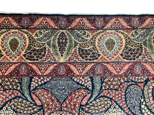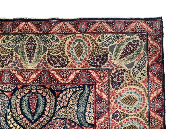 Tappeto Kirman, Persia, secolo XX. Decoro millefleur all over con motivi Boteh e di rami fioriti che in alcune riserve riproducono la corona dello scià di Persia in policromia su fondo blu notte. Bordura a riserve fiorite su fondo bianco. Cartiglio ad una testata con scrittura in persiano antico (cm 385x282) (difetti e rapature)