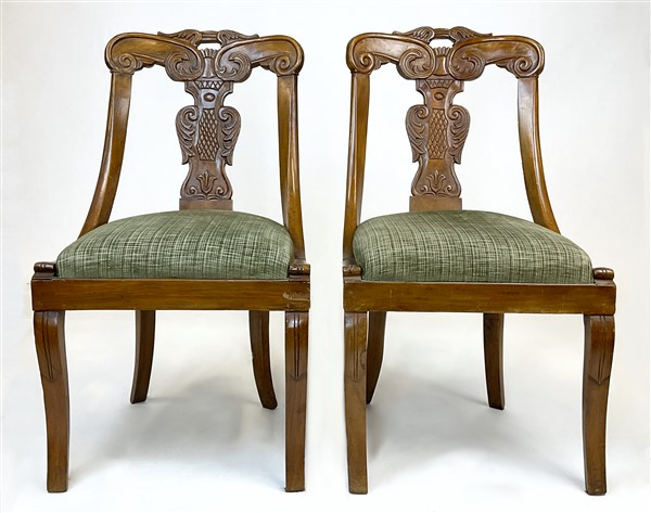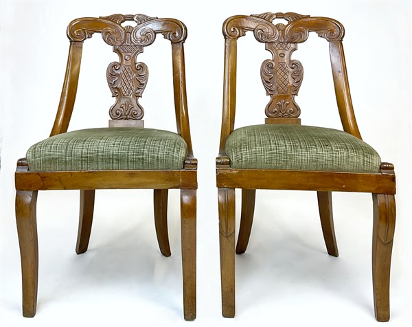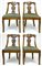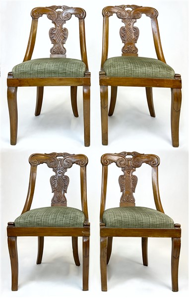Gruppo di quattro sedie a gondola in noce con schienale centrato da cartella e cimasa intagliate, gambe mosse (difetti)