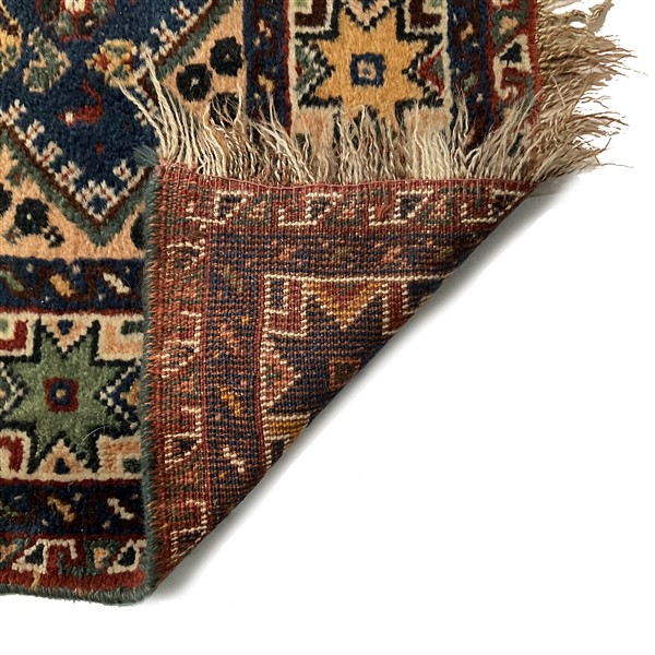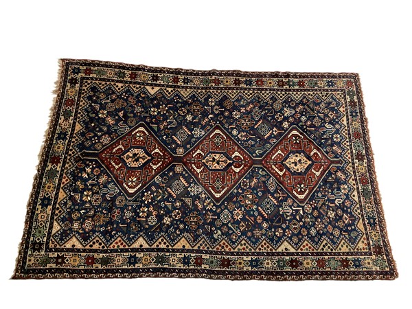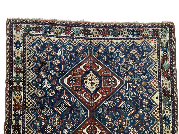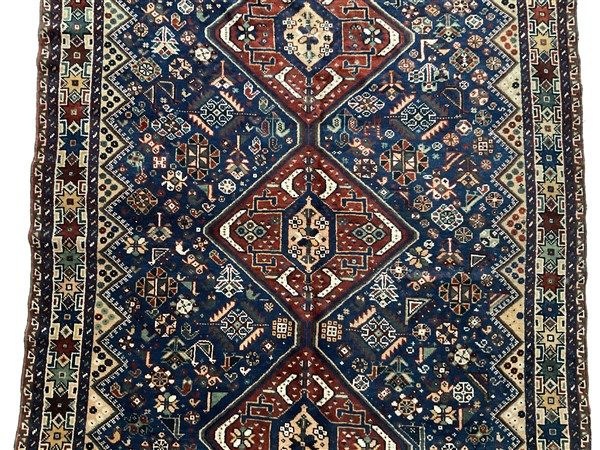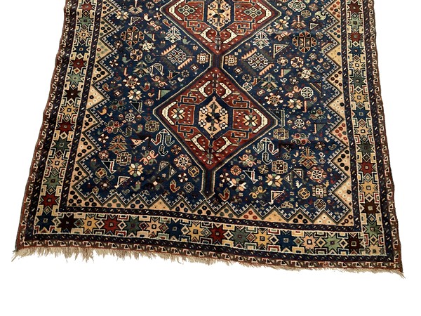Tappeto Shiraz, Persia, fine secolo XIX. Decoro con tre medaglioni romboidali a fondo rosso su campo blu cosparso di fiori e animali stilizzati (cm 249x166) (lievi difetti)