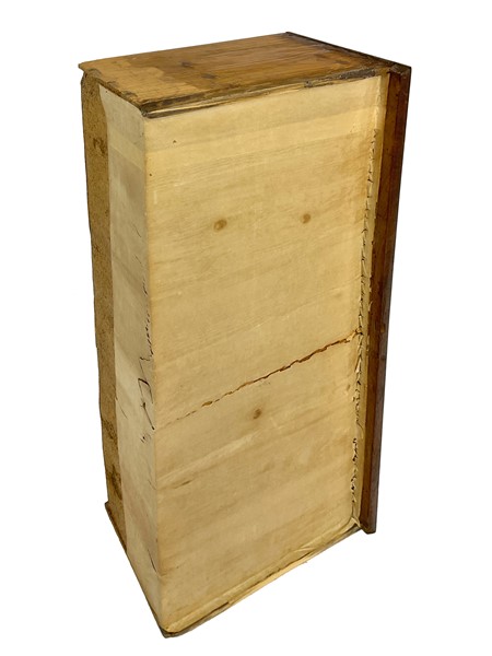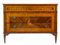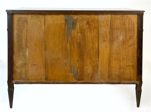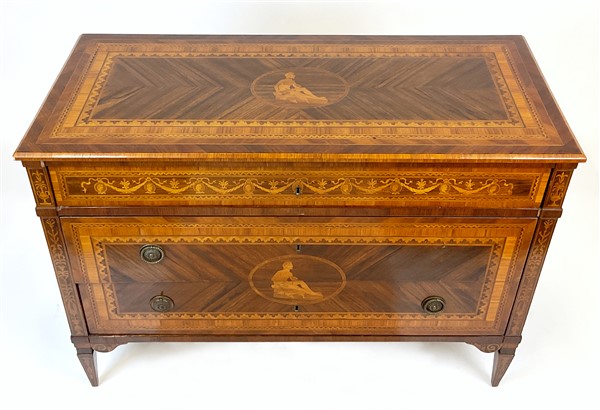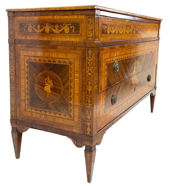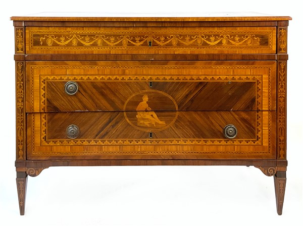Cassettone lastronato in palissandro e bois de rose, filettato e intarsiato in legni di varie essenze con tre cassetti sul fronte, decoro con figure entro riserva, montanti con candelabra e fasce con profili raccordati da festoni. Gambe ad obelisco rovesciato. Lombardia, secolo XVIII-XIX (cm 127x88x53) (difetti)