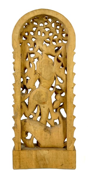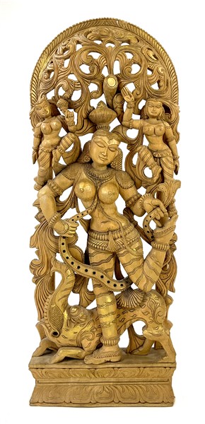Arte indiana, secolo XX. Scultura lignea raffigurante divinità, tracce di doratura (cm 28x77) (difetti)