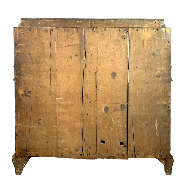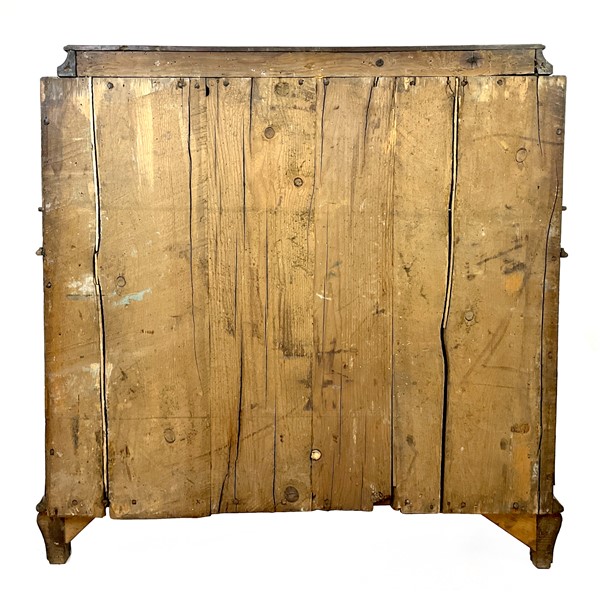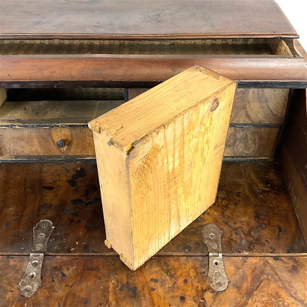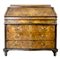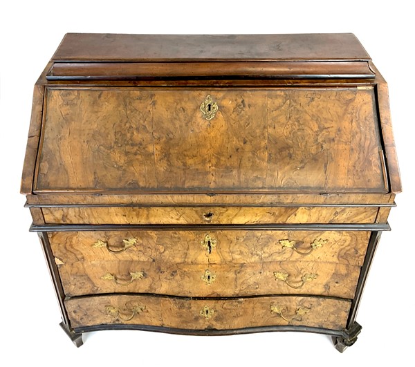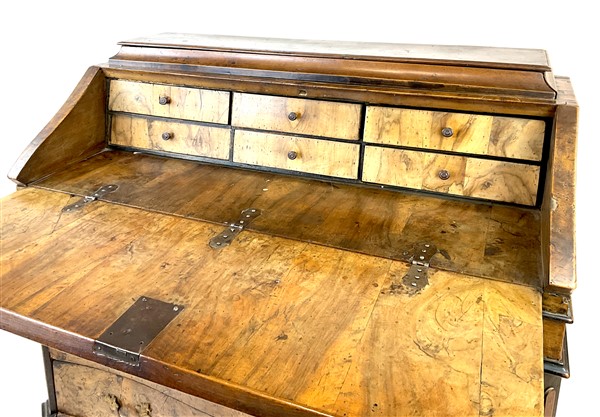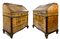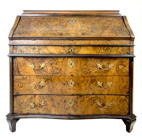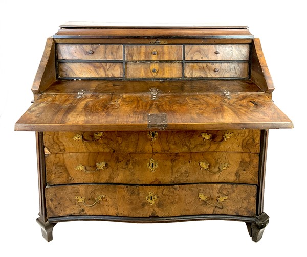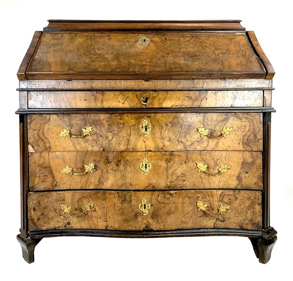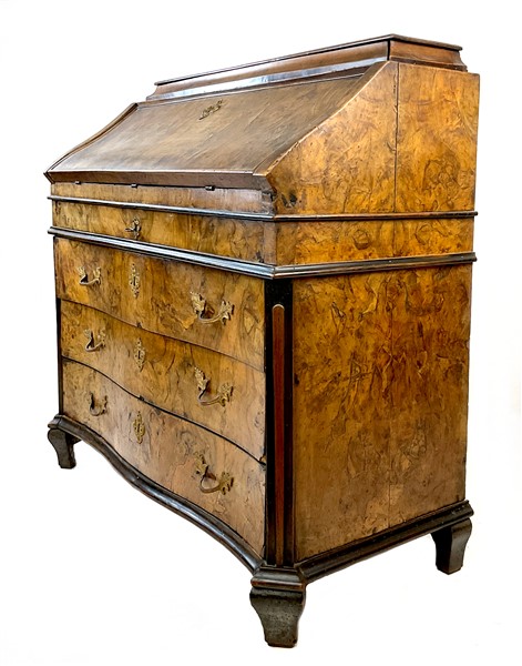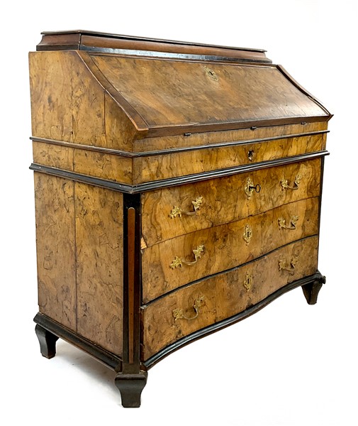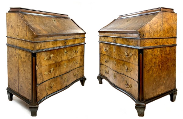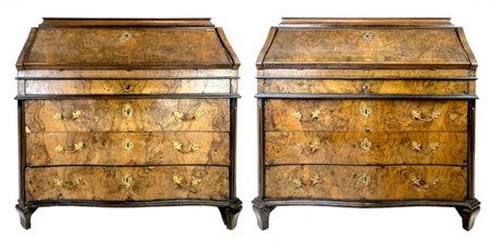 Coppia di ribalte lastronate in noce e radica di noce con profili ebanizzati. Fronte mosso a tre cassetti sotto uno a mezza altezza. Calatoia celante sei tiretti. Parte superiore con cassettino. Lombardia, secolo XVIII (cm 113x121x51) (difetti, mancanze e restauri)