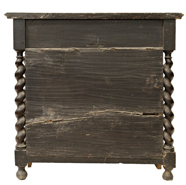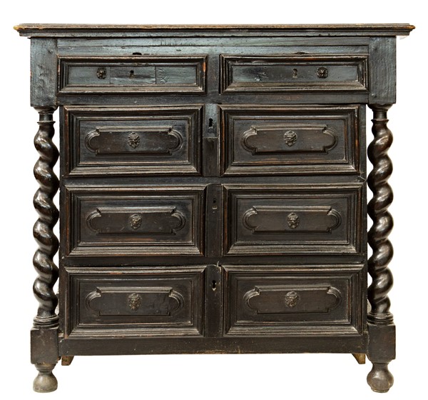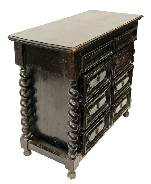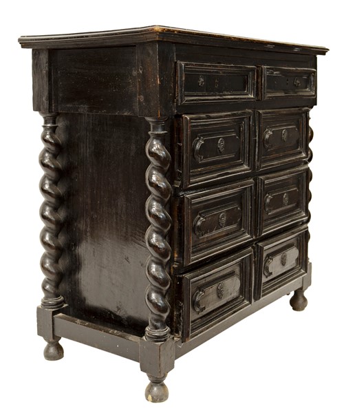 Mobile cassettiera in legno ebanizzato con montanti a colonna tortile, fronte a