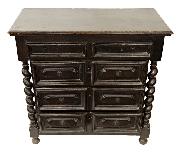 Mobile cassettiera in legno ebanizzato con montanti a colonna tortile, fronte a cinque diversi cassetti pannellati (cm 88x83x43) (difetti e mancanze)