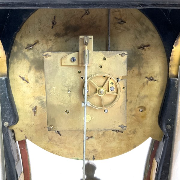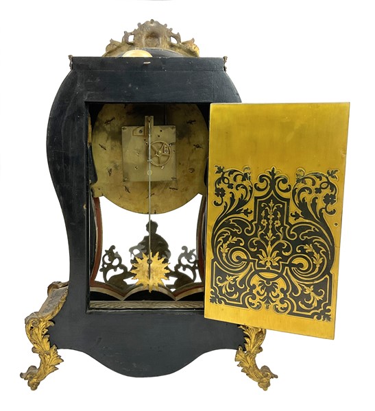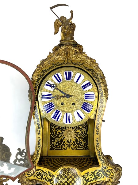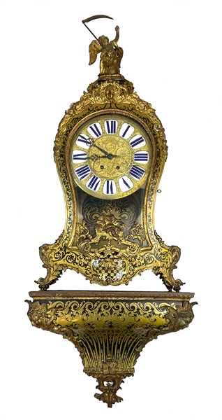 Orologio del tipo Cartel con mensola di forma mossa con cassa in bronzi dorati e marqueterie in tartaruga.