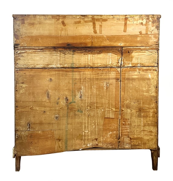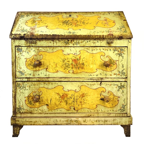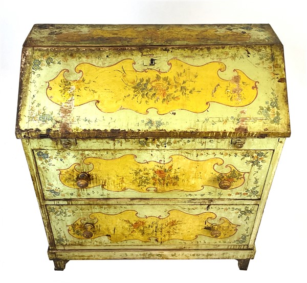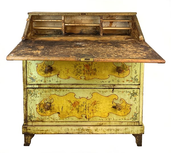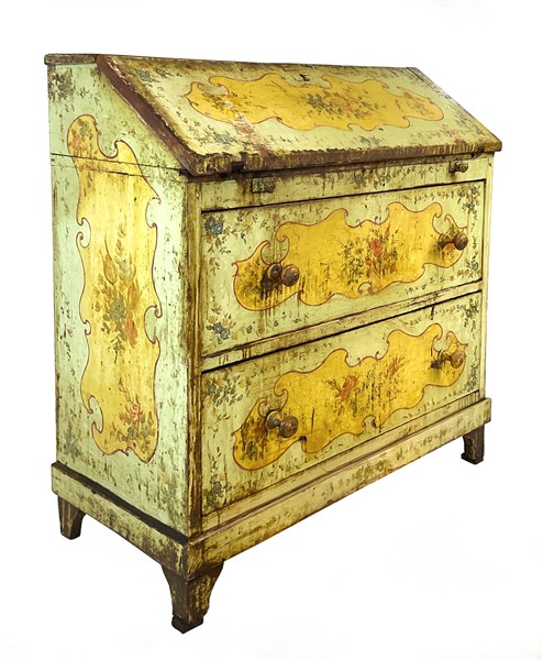 Ribalta in legno dipinto in policromia a motivo floreale. Fronte a due cassetti con calatoia celante vani (cm 86x97,5x41) (difetti e restauri)