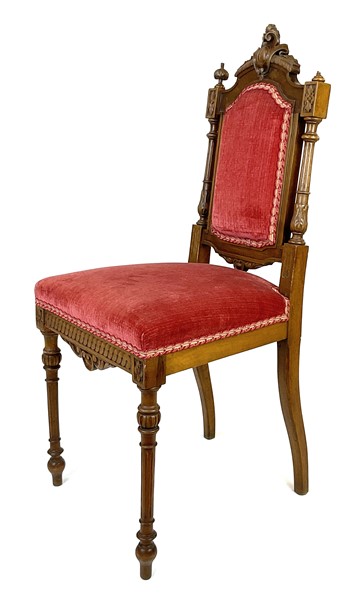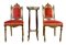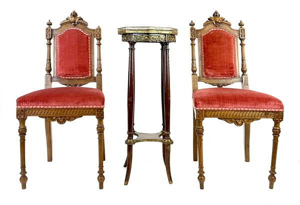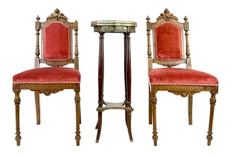 Lotto composto da gueridon con piano ottagonale in marmo e gambe tornite raccordate, fregi in metallo dorato (h cm 79) e coppia di sedie in noce intagliato con gambe anteriori e montanti scanalati (difetti e mancanze)