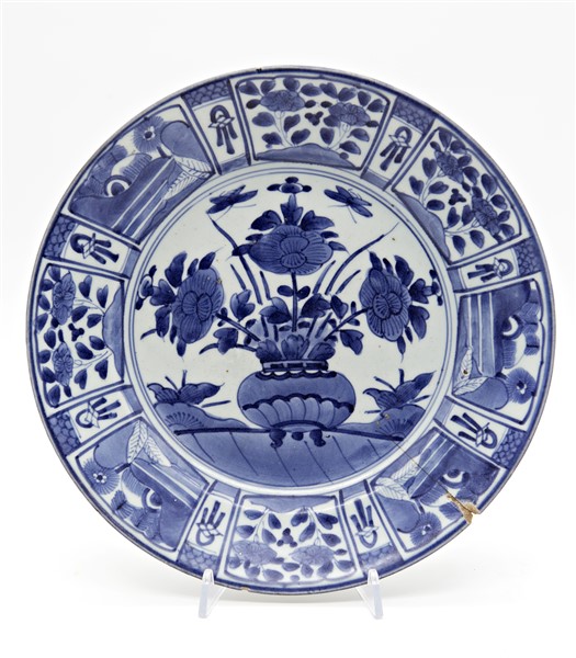 Tre piatti in porcellana bianca e blu decorati con motivi floreali Cina, secol