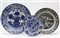 Tre piatti in porcellana bianca e blu decorati con motivi floreali