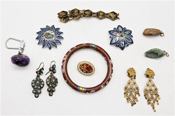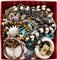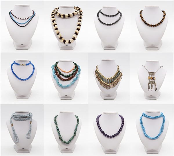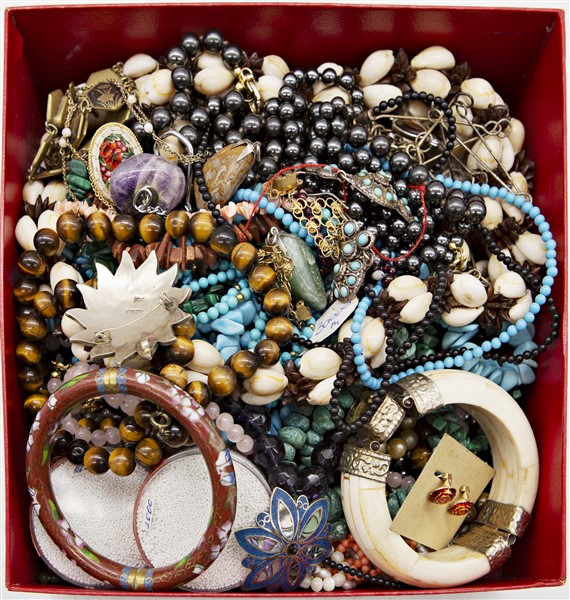 Scatola contenente numerose collane tra cui alcune con boules in occhio di tigr