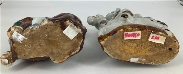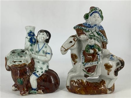 Due figure in porcellana policroma raffigurante un calivere con bambino e una figura femminile su animale fantastico