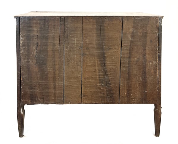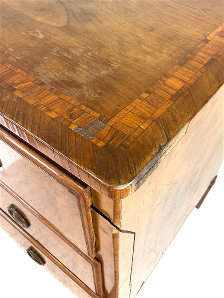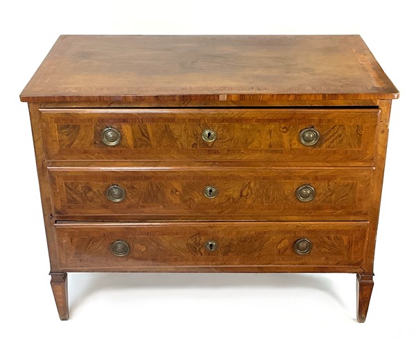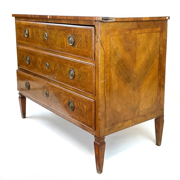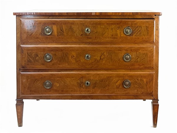 Cassettone lastronato in noce e filettato in legni vari, fronte a tre cassetti e gambe a obelisco rovesciato. Inizio secolo XIX (cm 111x90x59) (difetti e mancanze)