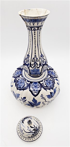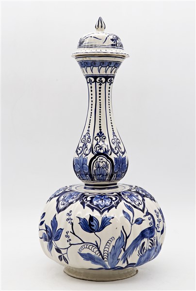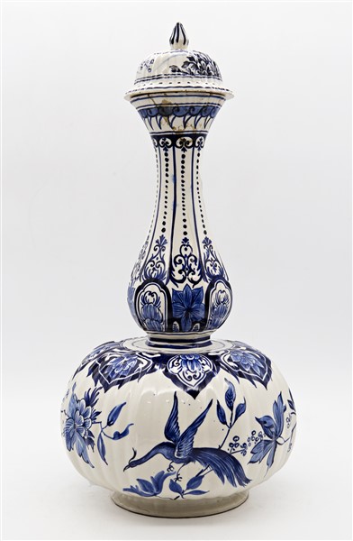 Manifattura di Delft. Vaso con coperchio in maiolica decorata nei toni del blu a foglie, fiori e volatili (h cm 52) (difetti e restauri al collo)