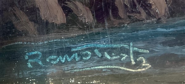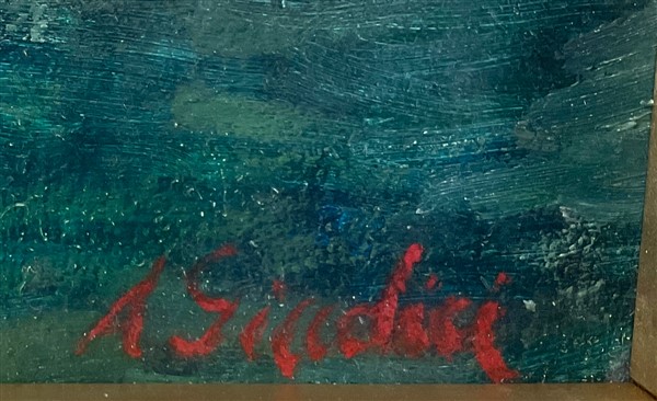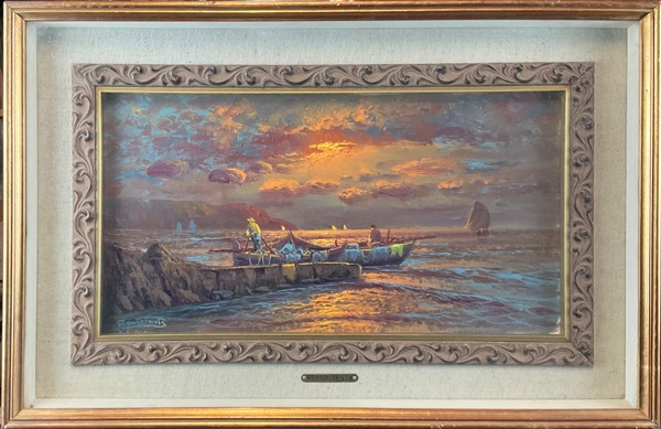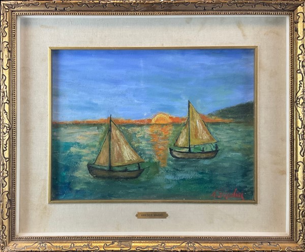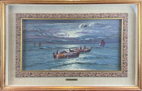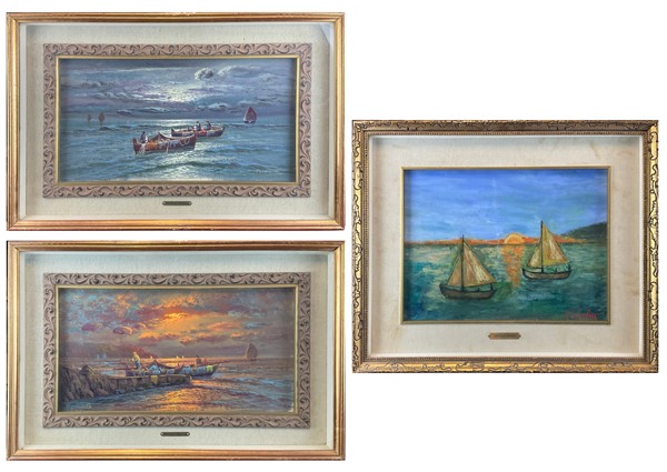 Lotto composto da due dipinti ad olio su cartone telato raffiguranti marine con pescatori firmati Remo Testa (cm 25x44), ed un olio su tela raffigurante marina al tramonto con vele firmato Amedeo Giudici (cm 30x40), in cornici (lievi difetti)