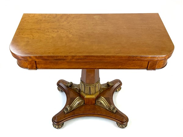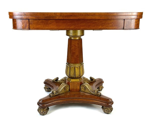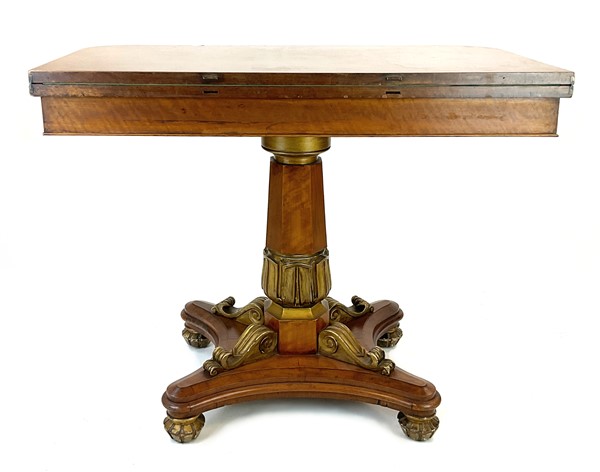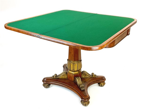 Tavolino da gioco con piano girevole e ribaltabile, interno con riserva in panno verde. Sostegno a balaustro con base sagomata intagliato e parzialmente dorato (chiuso, cm 92x74x45,5) (difetti)