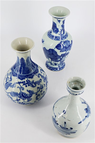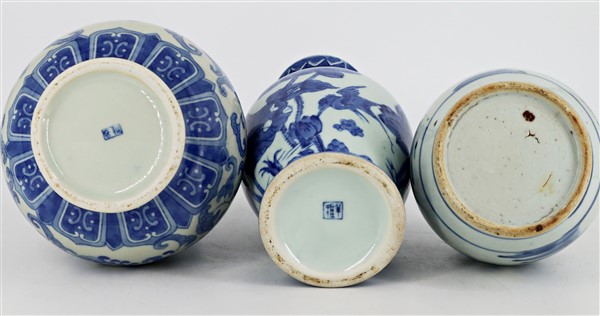 Tre vasi in porcellana bianca e blu decorati con motivi floreali e paesaggio Ci
