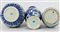 Tre vasi in porcellana bianca e blu decorati con motivi floreali e paesaggio