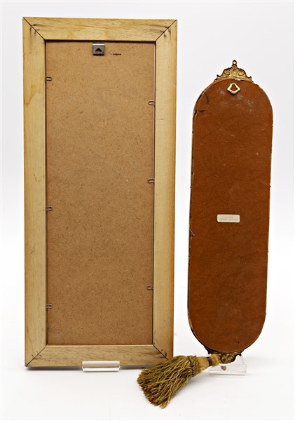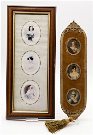 Lotto composto da tre diverse miniature ovali raffiguranti busti di dame entro unica cornice sagomata in metallo dorato e tre riproduzioni di busti di dama in unica cornice (h max cm 46) (difetti)