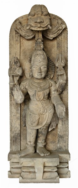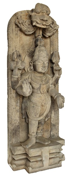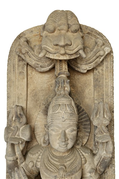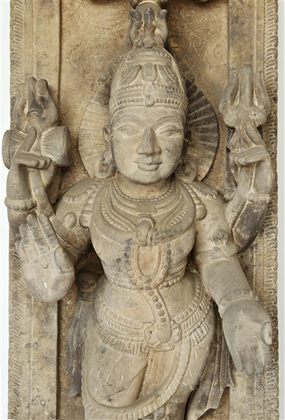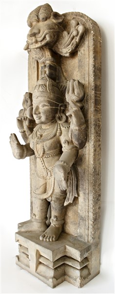 Arte indiana. Scultura in pietra scolpita raffigurante la divinità Lakshmi. (cm 55x152x30) (difetti)