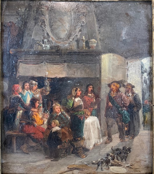 Giulio Gorra "Nella locanda" olio su tavola (cm 21x18) firmato in basso a sinis