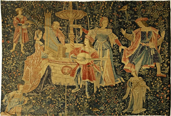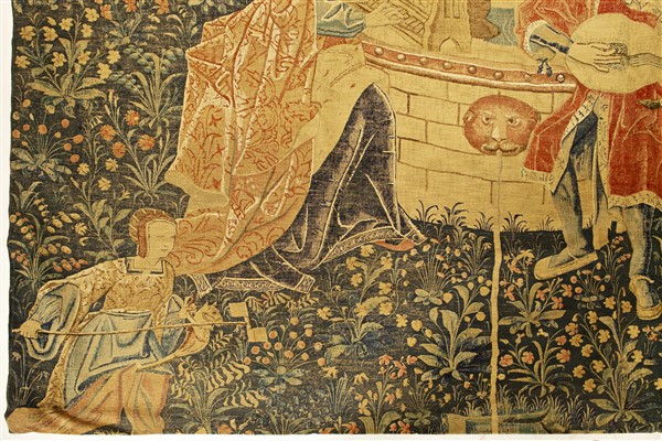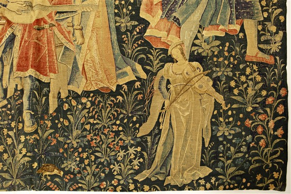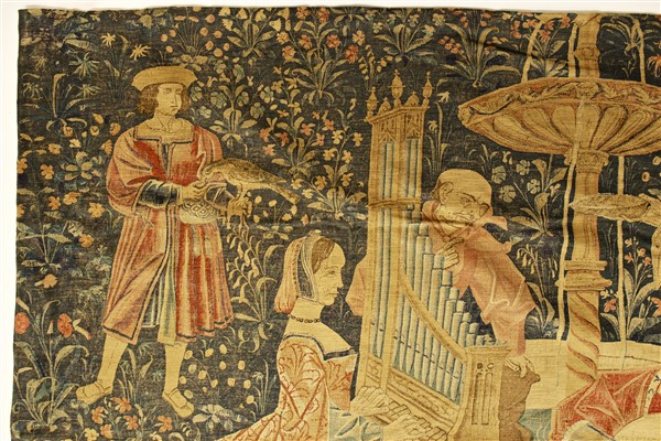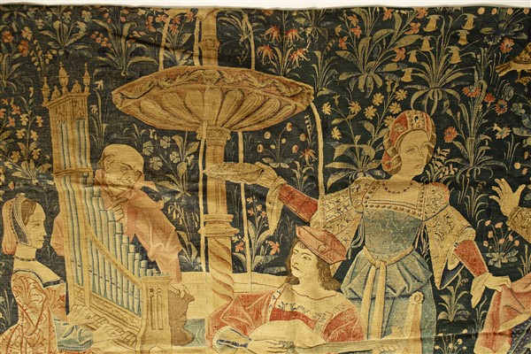 Arazzo in tessuto stampato con motivo medievale del tipo de la dama e l’unicorno con scena di vita di corte con dame e musici su prato fiorito (cm 252x191) (difetti)