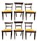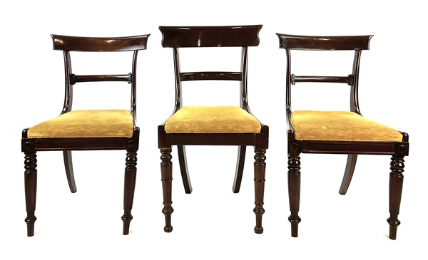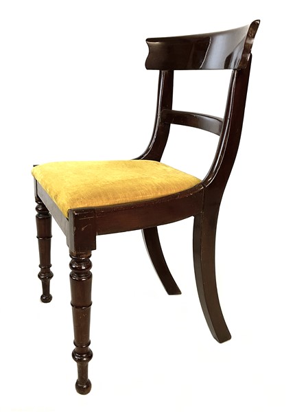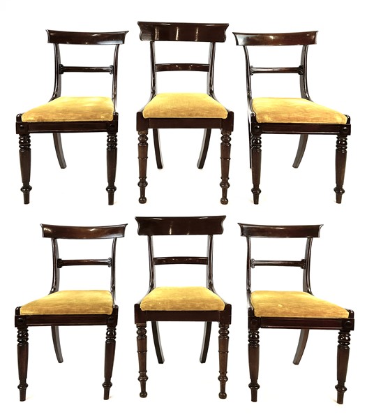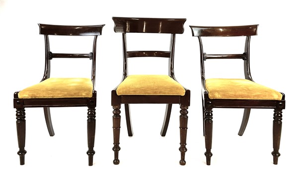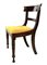 Lotto composto da quattro sedie in mogano con schienali a giorno, gambe anteriori tornite e posteriori a sciabola, sedute rivestite in tessuto giallo e due sedie similari. Inghilterra, inizio secolo XX (difetti e restauri)