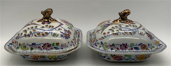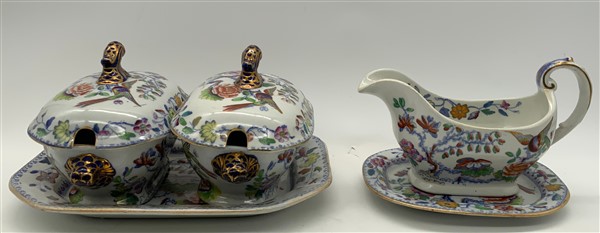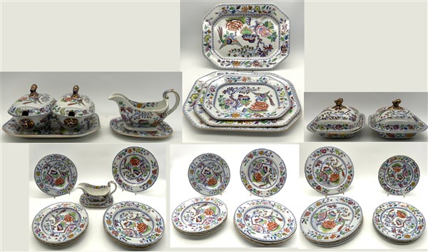 Manifattura Mason's. Servizio di piatti in ceramica decorata in policromia a motivi naturalistici, composto da due serie di dodici piatti piani e fondi di differenti diametri, dodici piatti da frutta, cinque diversi vassoi ottagonali, coppia di legumiere con coperchio, coppia di salsiere con coperchio, una salsiera con piattino (difetti)