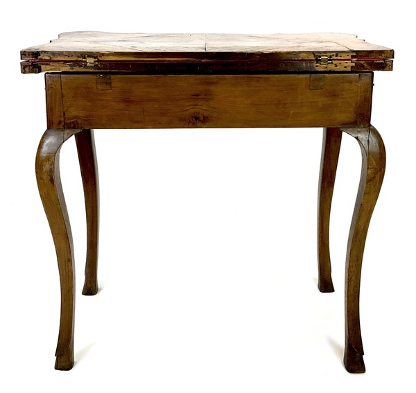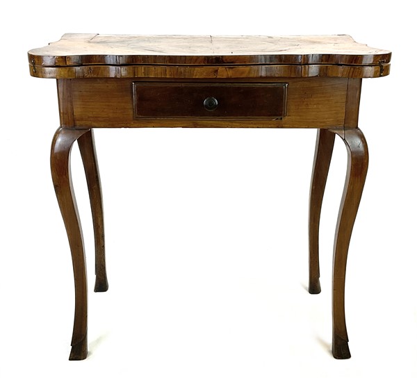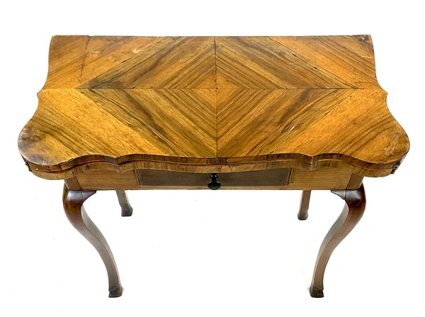 Tavolino da gioco in noce con cassetto nella fascia e piano a libro sagomato e