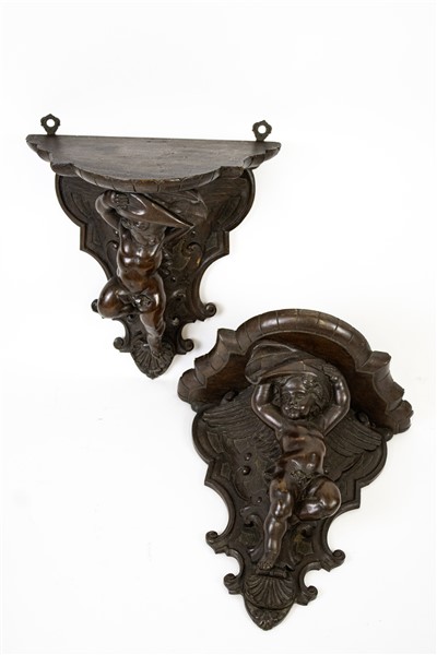 Coppia di mensole in legno intagliato a forma di angioletti su pannelli sagomati con piani polilobati. Secolo XIX-XX (cm 37,5x40x22) (difetti)