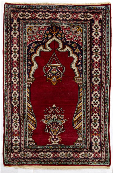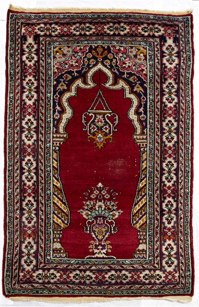 Coppia di tappeti preghiera Anatolia, secolo XX. Mirab a fondo rosso con lampada votiva e vaso fiorito (cm 128x79) (difetti)
