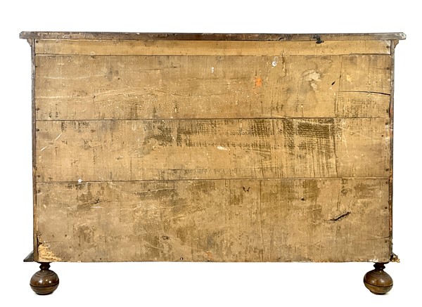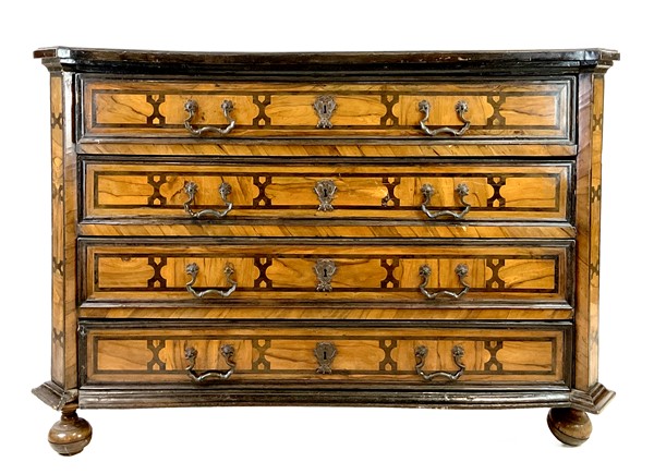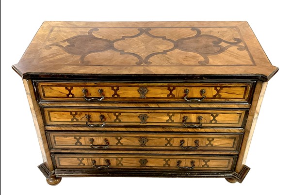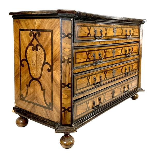 Cassettone lastronato in noce e intarsiato a volute in legni vari, fronte a quattro cassetti, piedi a cipolla. Piemonte, secolo XVIII (cm 139x93x66) (difetti e restauri)