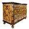 Cassettone lastronato in noce e intarsiato a volute in legni vari, fronte a qua