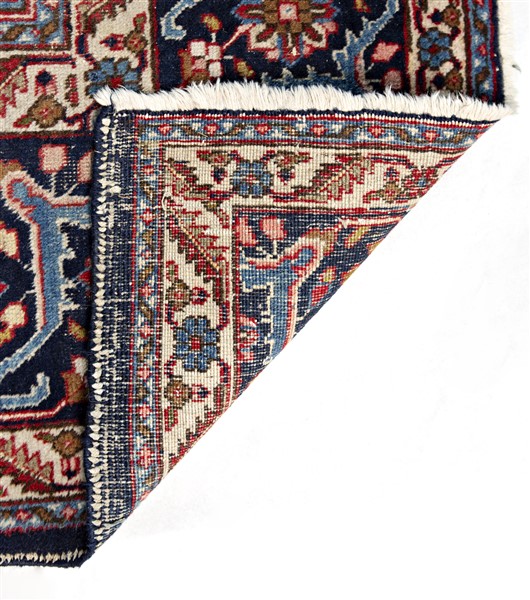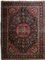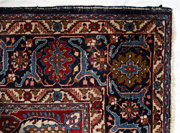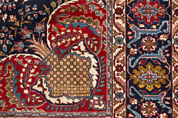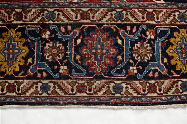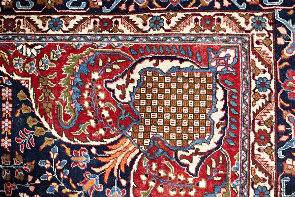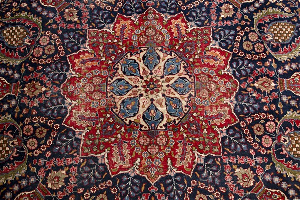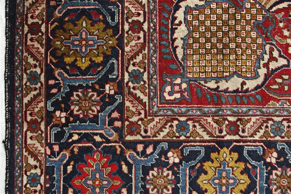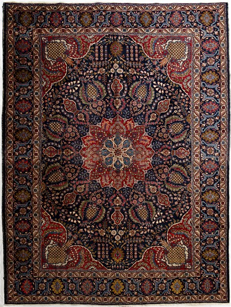 Tappeto Tabriz, Persia, secolo XX. Decoro con medaglione tipo Ardebil a fondo rosso e bianco su campo blu notte decorato con vasi fioriti (cm 390x286) (difetti)