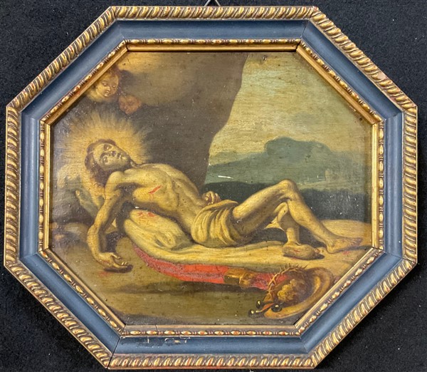 Antico dipinto ad olio su tavola ottagonale raffigurante "Cristo deposto"