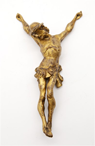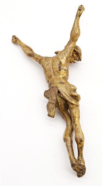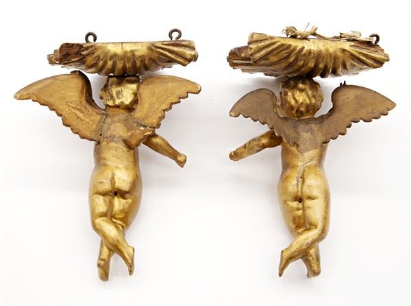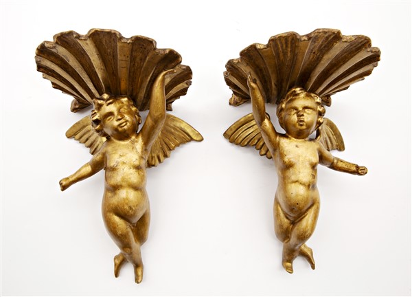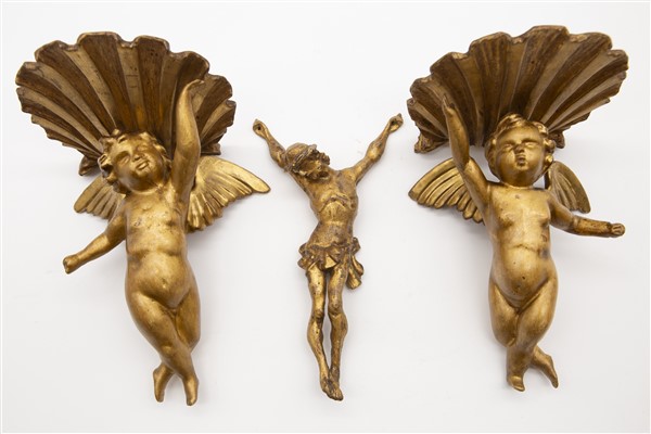 Lotto composto da una coppia di piccole mensole in legno intagliato e dorato a forma di angioletto con piano a valva di conchiglia e un Cristo Crocefisso (h max cm 21) (difetti e mancanze)