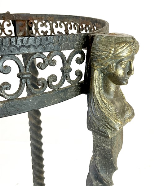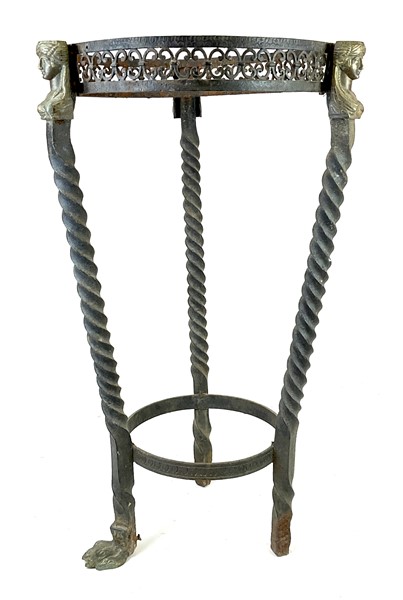 Lot 986 | Alzata tripode con montanti in ferro ritorto e fascia traforata, busti di erme
