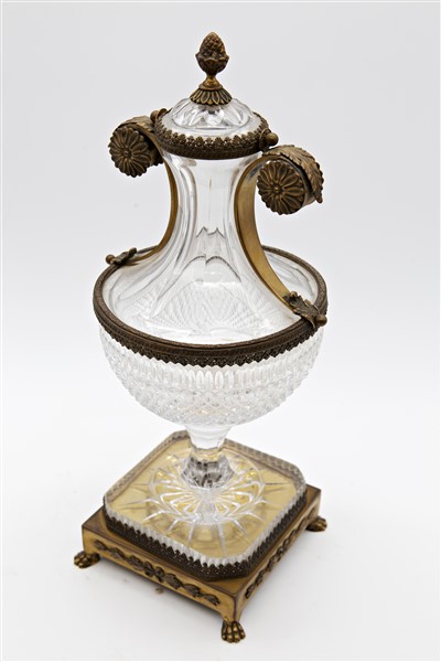 Elemento decorativo in vetro molato a balaustro con fregi e base in metallo dorato, anse a voluta e cimatura a pigna, base quadrata con piedi ferini. Inizio secolo XX (h cm 40) (lievi difetti)