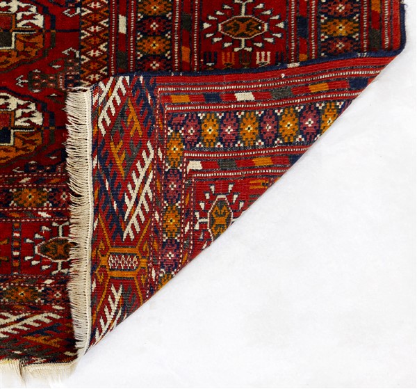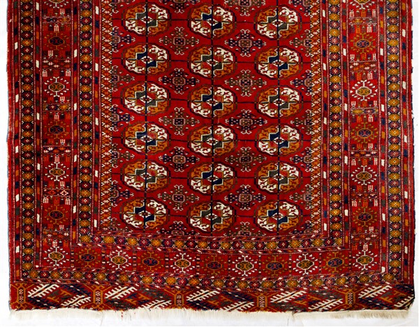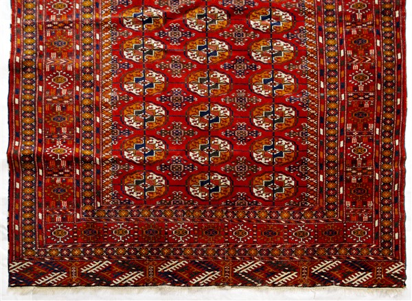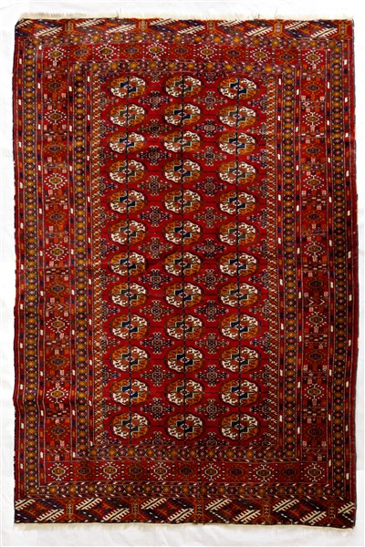 Tappeto Boukhara, Turkestan occidentale, secolo XX. Decoro con tre file di Gül su campo rosso (cm 183x130) (difetti)