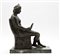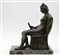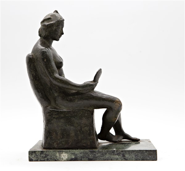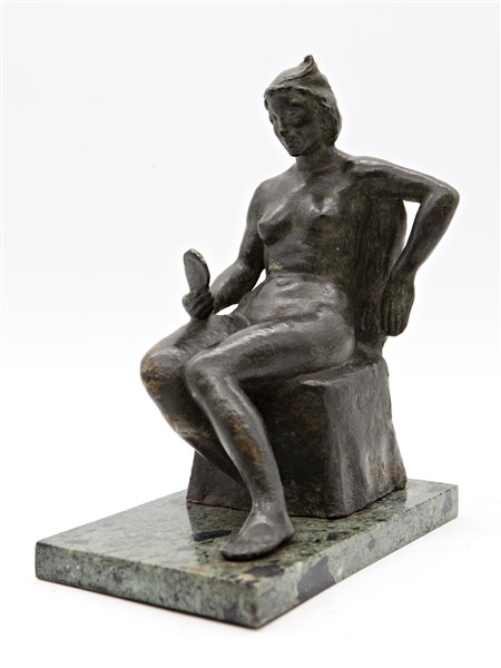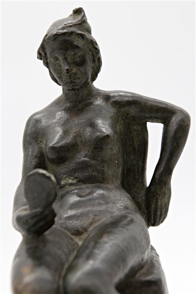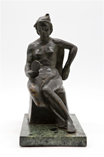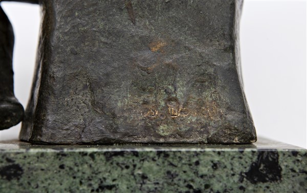 Firma indecifrata "Figura allegorica" bronzo a patina verde su base in marmo verde. Tracce di firma sul fronte (h tot. cm 27,5)