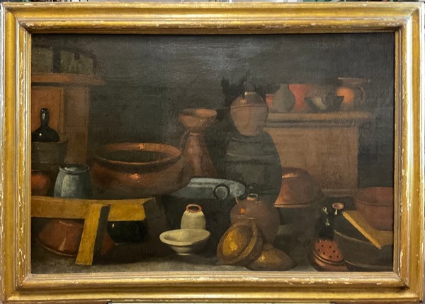 Scuola del secolo XVII "Composizione con anfore e bacili in rame" olio su tela