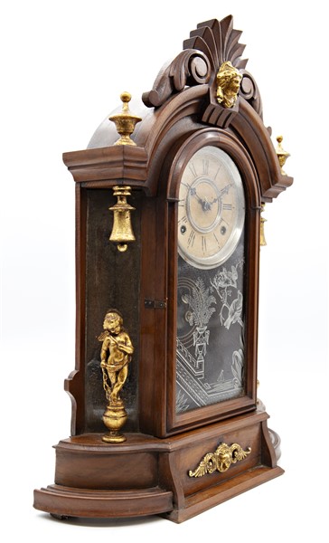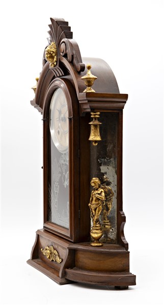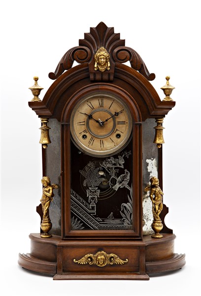 Pendola da appoggio con cassa in vetro e legno con fregi dorati.