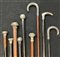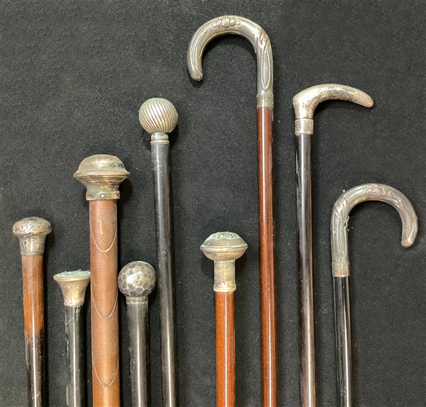 Collezione di nove bastoni da passeggio con fusti in legni differenti, alcuni con pomoli in argento e metallo argentato. Secolo XIX-XX (difetti)