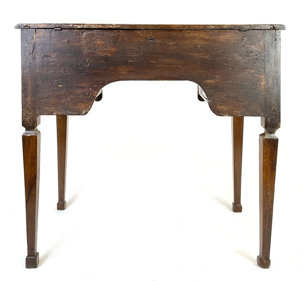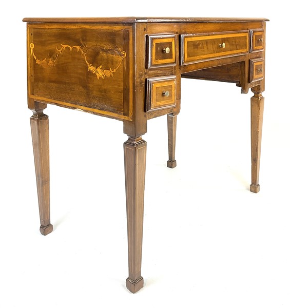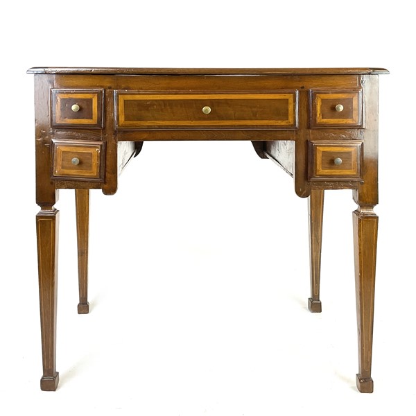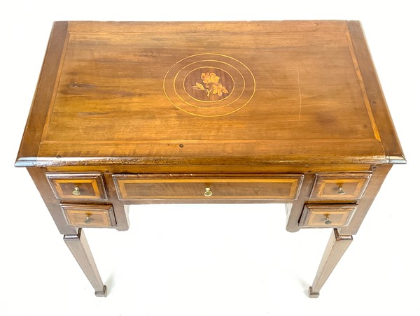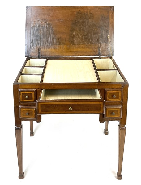 Toilette da parete in noce filettata e decorata da piccoli intarsi in legni vari. Fronte con tre diversi cassetti e due finti cassetti, gambe rastremate e piano ribaltabile celante vani. Secolo XIX (cm 78x77x45) (difetti e restauri)