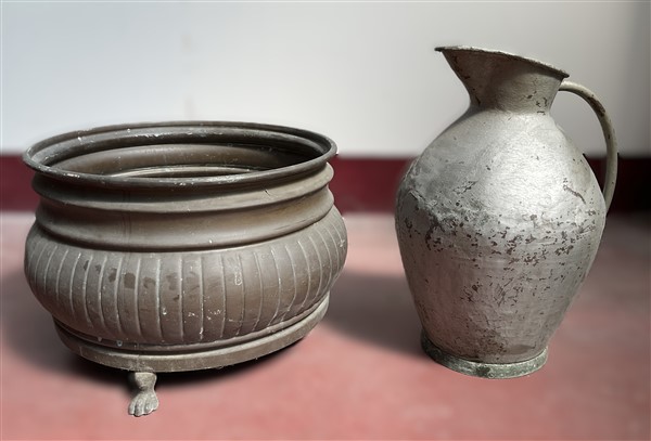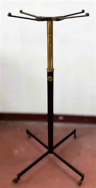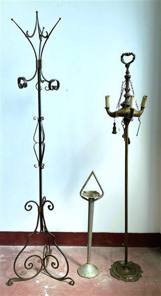 Lotto composto da una lampada fiorentina da terra in bronzo (h cm 170), un attaccapanni in ferro battuto (h cm 196), un posacenere da terra, un bacile ed un versatoio in metallo ed una base regolabile in ottone e metallo verniciato con ruotine (difetti)