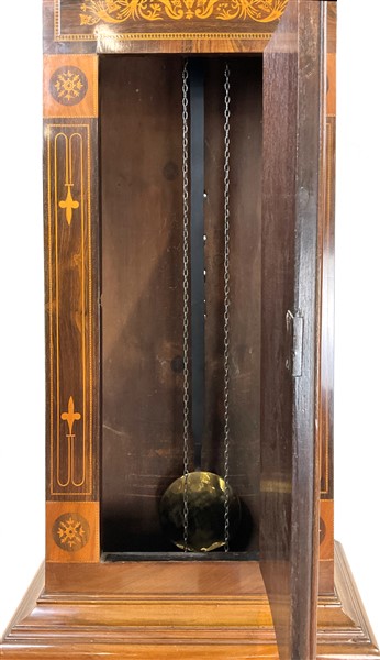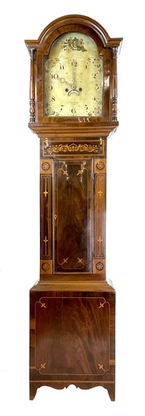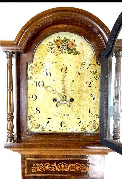 Orologio a torre con cassa impiallacciata e intarsiata in legni vari. Quadrante a numeri arabi dipinto a motivi floreali. Meccanismo con suoneria delle ore su campanello. Inghilterra o Scozia, prima metà secolo XIX (h cm 212) (difetti)