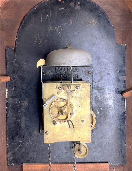 Orologio a torre con cassa impiallacciata e intarsiata in legni vari. Quadrante