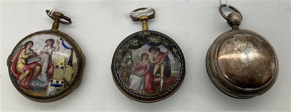 Lotto di tre orologi da tasca con cassa in metallo diverso, due con fronte decorato a smalti policromi, secolo XVIII-XIX (difetti e rotture)