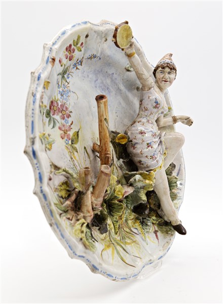 Manifattura di Bassano, inizio secolo XX. Piatto da parete in maiolica policroma decorata a rilievo con figura femminile con tamburello su fondo a fiori (d cm 38) (difetti e restauri)